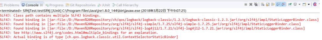 我们不能避免在系统中同时引入多个slf4j的实现,所以接收的地方是一个Set。大家应该注意到,上部分在演示同时引入logback、slf4j-simple、log4j的时候会有警告: