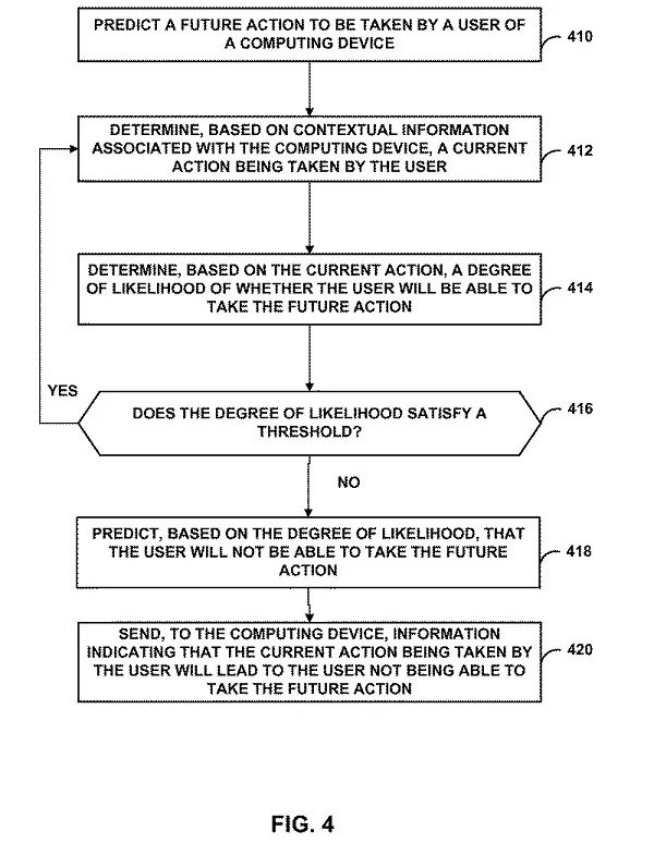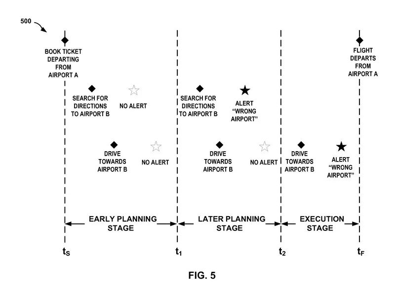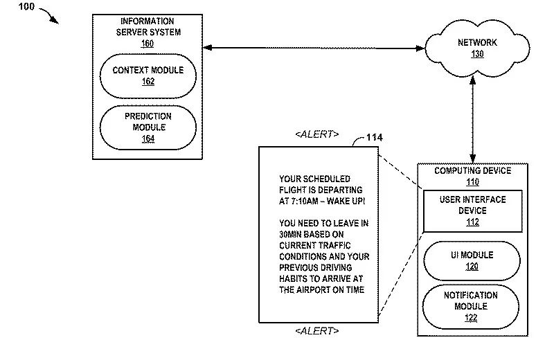实际上,这个专利文件中所描述的想法听起来很有用。它提出了一个系统,在其中你的设备将使用 Google 已经收集的信息,比如你的电子邮件收件箱的旅行行程,而当你你开始前往错误的机场,你的手机就会知会你走错了路。