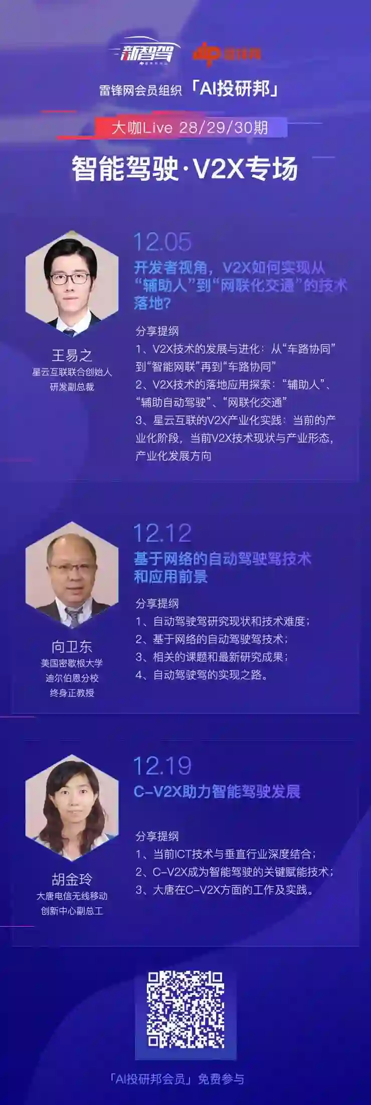 12 月 19 日(周三)晚 8 点,【大咖Live】第 30 期智能驾驶·V2X专场,我们邀请到大唐电信无线移动创新中心副总工胡金玲详细解析“C-V2X如何更好的助力智能驾驶发展?”。照例,本次分享对雷锋网旗下会员组织「AI投研邦」会员免费开放。