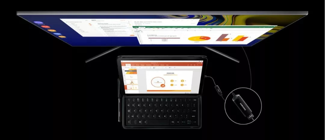 什么是 DeX?一根适配线连接显示器,打开 DeX 就能在显示器上获得笔记本桌面体验。这在平板上是首次,而且需要注意的是,这一次 Galaxy Tab S4 本身即可作为操作平台,因为如果一定连接显示器才能使用,那岂不是本末倒置。