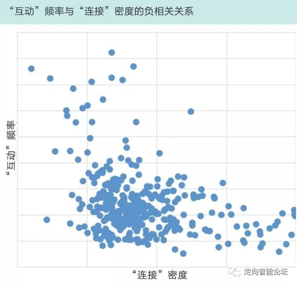 将所有351个城市的“连接”密度与“互动”频率做一个对比,会发现两者呈现显著的负相关关系——“连接”密度越大,“互动”频率越低。加入城市规模的维度,会发现越大的城市,人们手机里联系人越多(“连接”密度越高),而与每个联系人的平均互动次数越少(“互动”频率越小)。