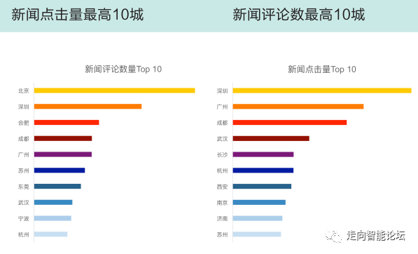 2017年打开新闻次数最多的城市前五位分别为深圳、广州、成都、武汉和长沙;看罢新闻留言评论次数最多的城市前五名分别为北京、深圳、合肥、成都和广州。