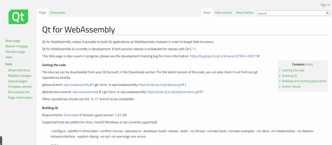 在 Qt 5.11.0 发布时,使用者就能通过 Qt 将 C++ 代码编译成 WebAssembly,并且直接在浏览器中执行 Qt 应用程序,但目前仅支持客户端的应用。官方文件提到,由于现在仍在技术预览版,还有许多已知问题尚未解决,包括现在无法将 Windows 作为主机平台,但可以使用适用于 Linux 的 Windows 子系统。