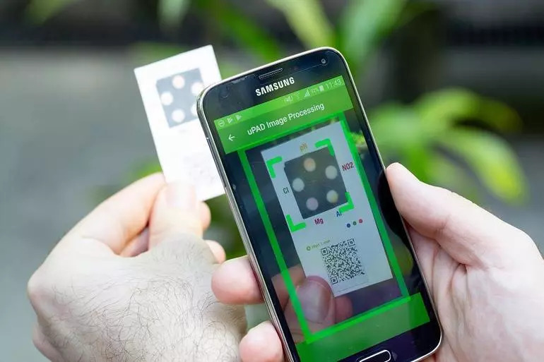 IBM管这个原型机叫AgroPad,是一个名片大小的纸质设备,内部搭载一个微流控芯片,能够在10秒内对水或者土壤样品进行化学分析,测试者只需将样品放在卡的一侧,另一侧则有一组圆圈显色提供比色测试结果,每个圆圈的颜色代表样品中特定化学物质的量,再通过专用移动应用程序获取AgroPad的快照。通过专用的应用程序,测试者能立即获取更为精确的结果,机器视觉能够将颜色组成和强度转化为化学数值,其结果比人眼比对色卡更为可靠。