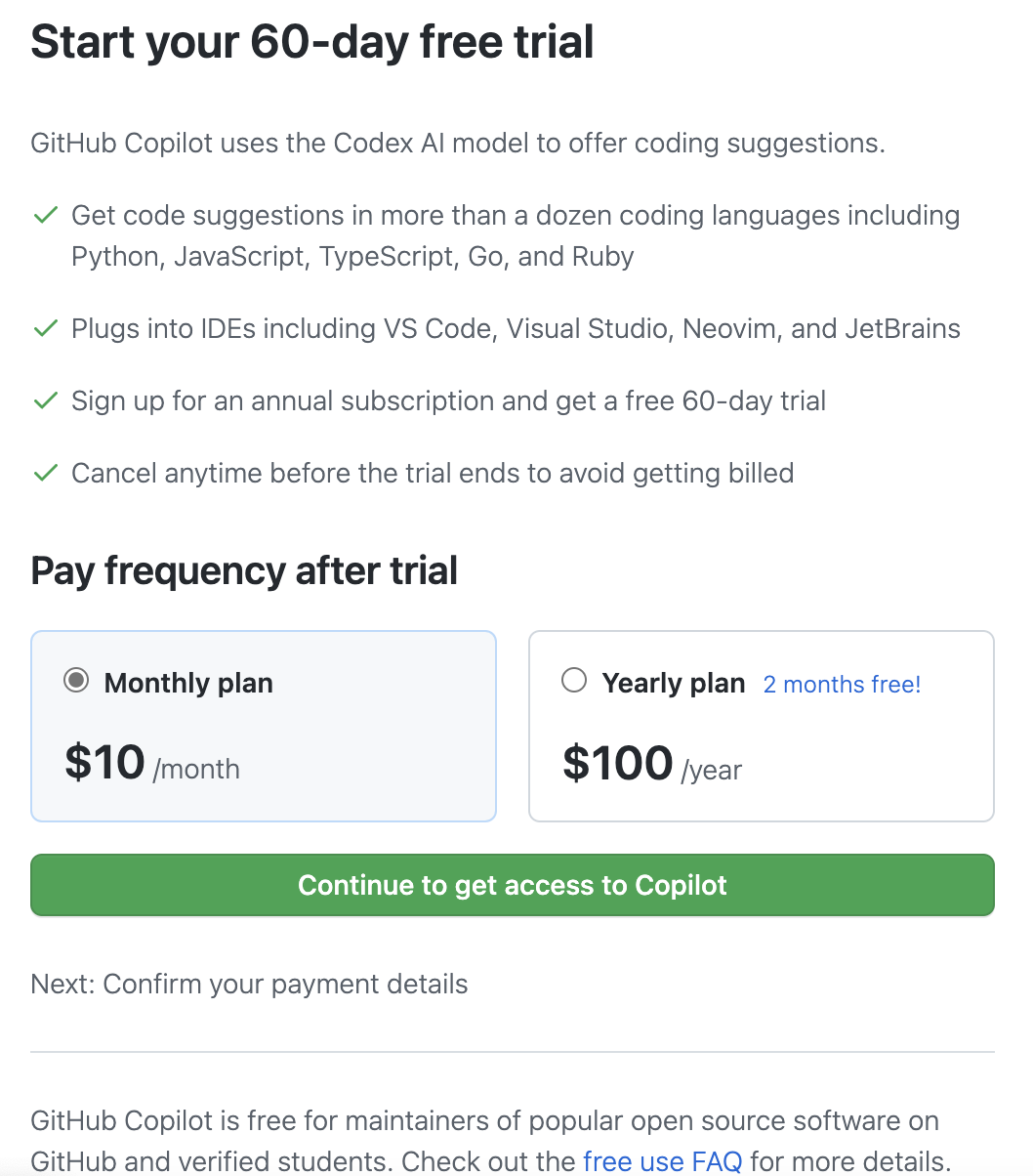 GitHub 于今天重磅宣布,其与 OpenAI 联合构建的 AI 自动编程工具 Copilot 正式发布,现以每月 10 美元(人民币约 67 元)或每年 100 美元(人民币约 669 元)的价格出售,并提供 60 天的免费试用期。
