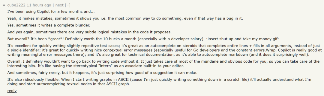 另一位已经使用 Copilot 几个月了开发者也表示,尽管 Copilot 会犯很多错误,但总的来说它一直都很好!绝对值得每个月花 10 美元(特别是相对开发人员的工资来说)。