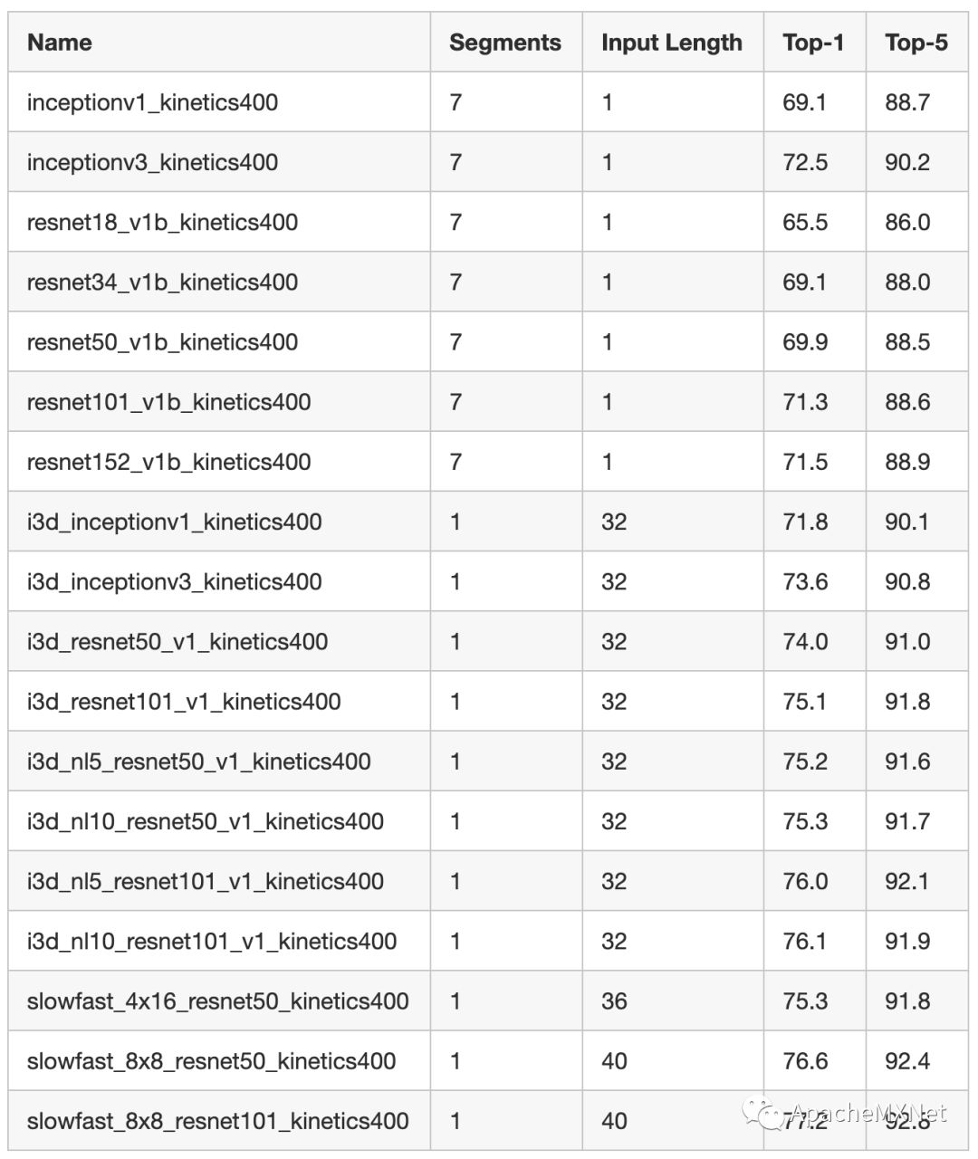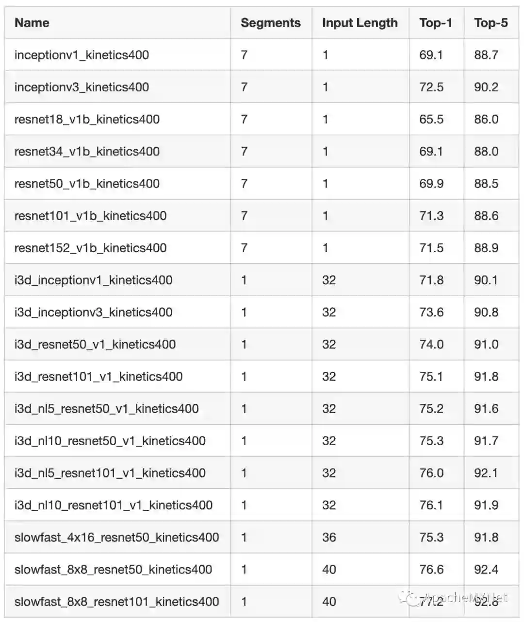 最近 Facebook 也刚刚开源了他们的视频理解库,PySlowFast。相比而言,我们提供更多更全的模型和数据库的支持。下面的表格列出了我们在 Kinetics400 数据集上提供的预训练模型,