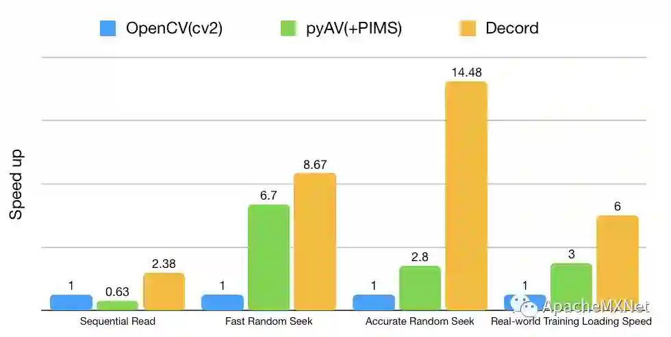 如下图所示,相比已有的视频加载器,OpenCV 和 PyAV, 我们的 decord 至少快两倍以上,尤其在随机取帧的时候,更是快八倍以上,导师再也不用担心我的实验被卡 IO 了。