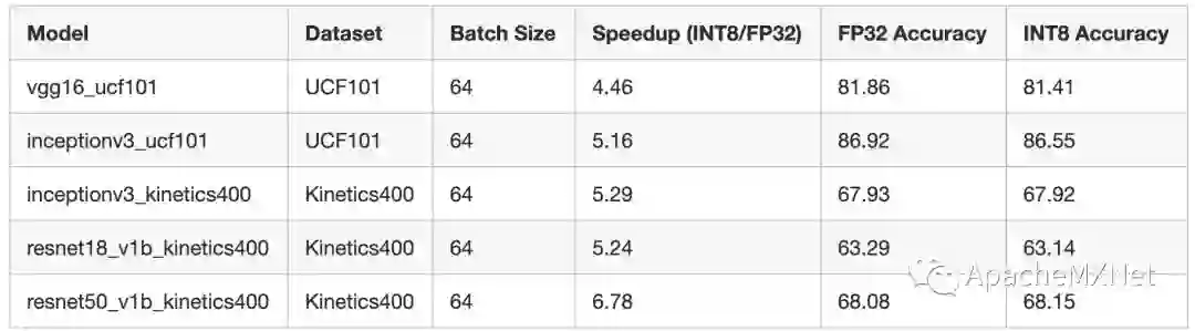 GluonCV 继续与英特尔携手带来更多的 INT8 量化模型。受益于 Intel Deep Learning Boost(VNNI) 的加持,用 INT8 量化后的视频理解模型比它们原本的 32 位浮点数版本要快许多。因为是快速部署,我们只提供了部分 2D 模型的量化模型。下表是基于 AWS EC2 C5 实例的结果,在保持原有精度的情况下, 量化过的模型可以达到 5 倍的提速。