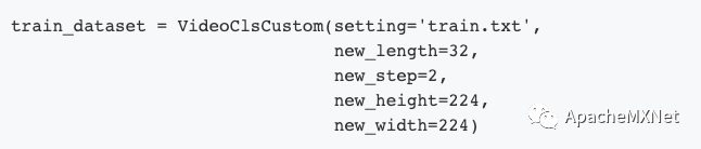 每一行需要提供 3 个信息,分别是视频存放的路径,视频的长度以及视频的类别。如果用户已经将视频抽成了帧也不要紧, 只需要把对应视频路径换成视频帧文件夹的路径即可。比如我们现在要加载一个数据集,要随机从一段视频中抽取一个视频片段,长为 64 帧,隔帧取样,同时调整帧的大小为 224x224。