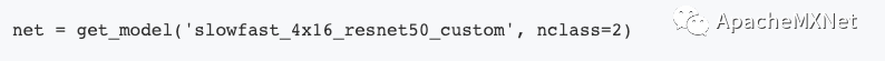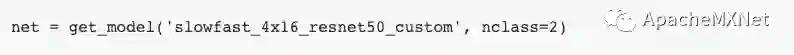 其次是自定义的模型,我们提供了几个常见模型的自定义版本,比如 slowfast_4x16_resnet50_custom。用户在根据自己的数据集建立模型的时候,可以直接调用这个函数,只需要提供数据集里有几类就可以了。比如用一个视频异常检测的数据集做一个二分类问题,