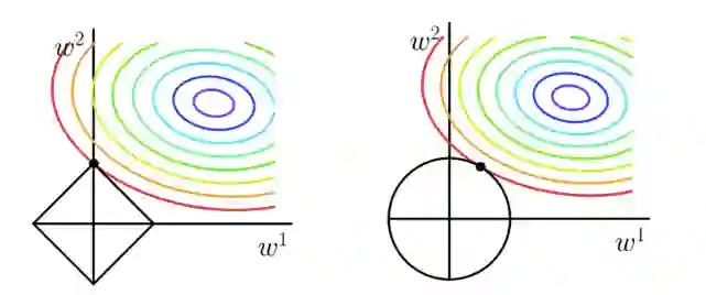 上图代表的意思就是目标函数-平方误差项的等值线和L1、L2范数等值线(左边是L1),我们正则化后的代价函数需要求解的目标就是在经验风险和模型复杂度之间的平衡取舍,在图中形象地表示就是黑色线与彩色线的交叉点。