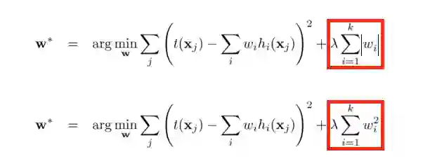 针对线性回归模型,假设对其代价函数里加入正则化项,其中L1和L2正则化项的表示分别如下所示,其中λ >= 0,是用来平衡正则化项和经验风险的系数。