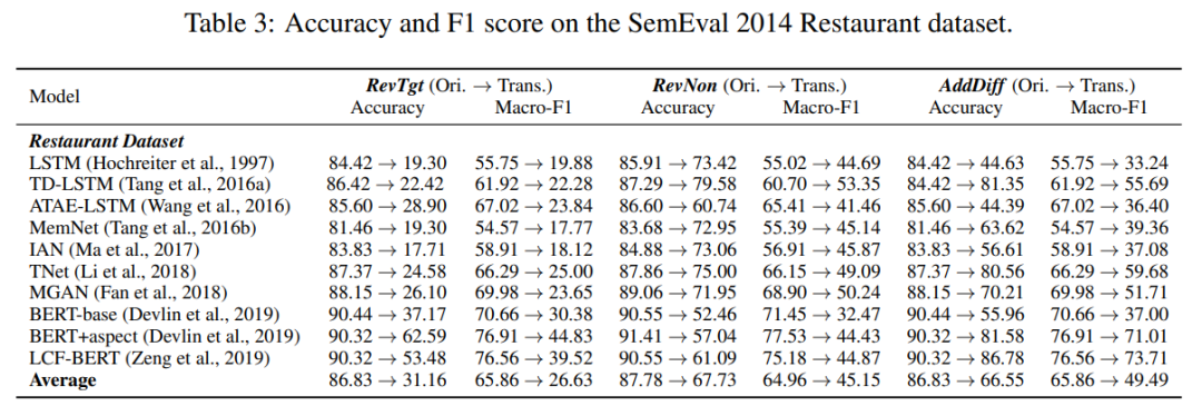 SemEval 2014 Restaurant 数据集上的准确率和 F1 分数对比。