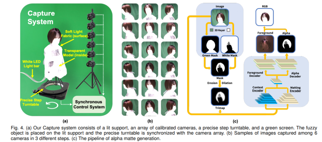 捕捉系统包含 lit support、一组校准摄像头、一个精确的步骤 turntable 和绿幕。