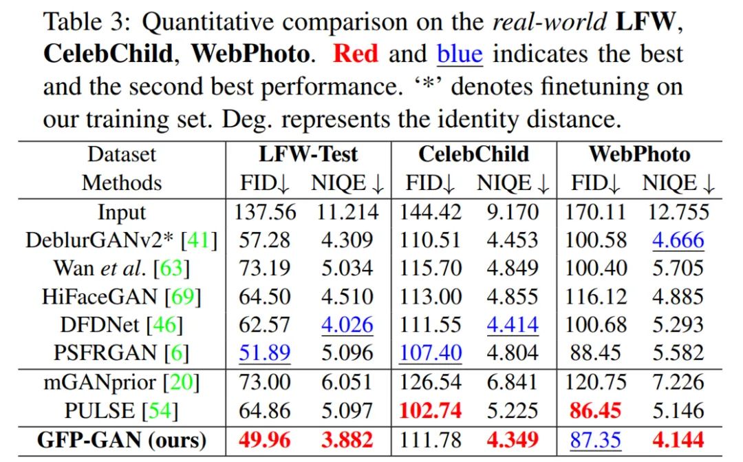 在实际人脸测试指标上,GFP-GAN 也具有较好的 FID 和 NIQE。