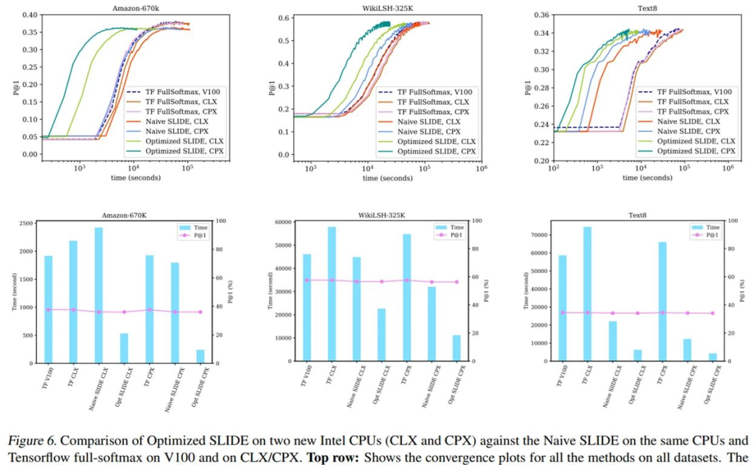 在英特尔 CLX 和 CPX 上,优化后的 SLIDE 与未优化的 SLIDE、英伟达 V100 和 CLX/CPX 上 Tensorflow full-softmax 的对比。