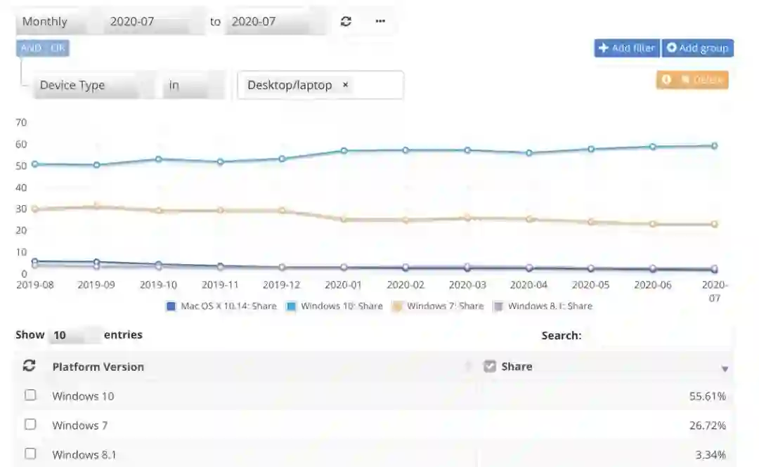 根据 NetMarketShare 发布的浏览器与操作系统市场份额数据,截至今年 7 月,Windows 10 的市场份额仅达到 55.61%,而 Windows 7 和 WIndows 8 则分别占据 26.72% 和 3.34%。