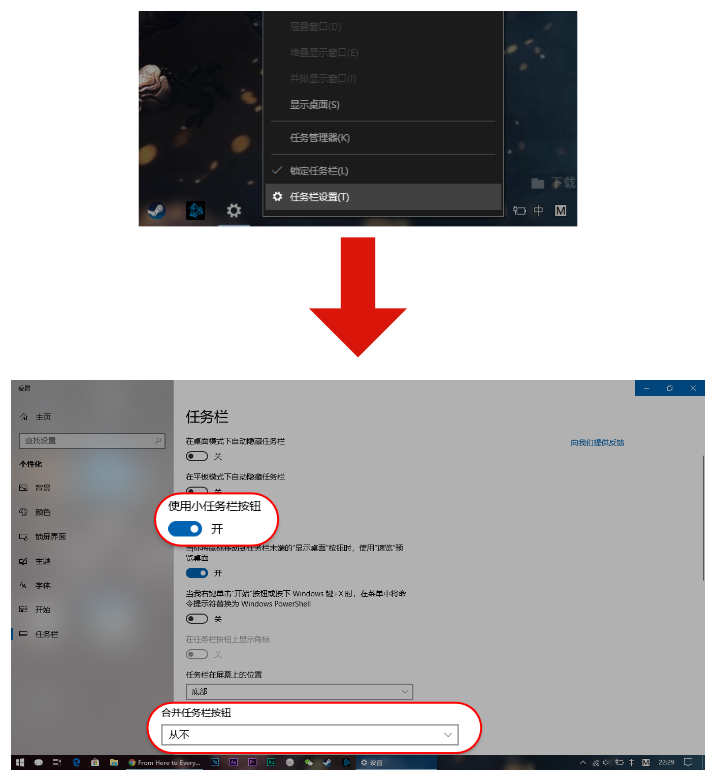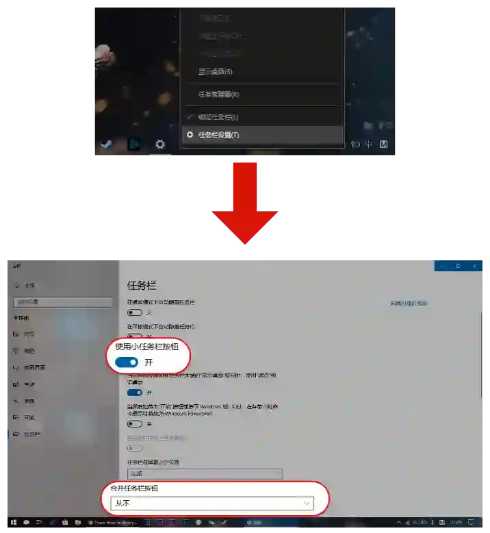 在 Windows 10 中,你可以通过修改设置来「找回」Windows XP 样式的任务栏。首先,你需要右键点击任务栏空白处,选择「任务栏设置」,随后开启「使用小任务栏按钮」并将「合并任务栏按钮」改为「从不合并」即可。