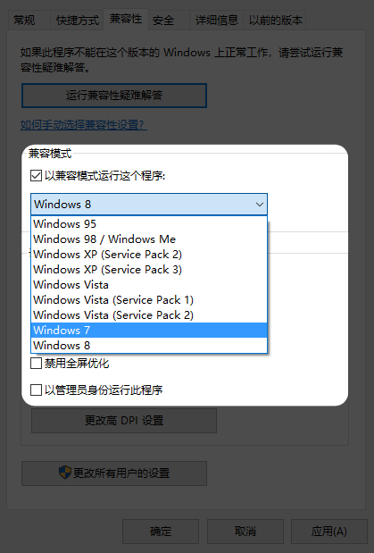 其实,Windows 早在 XP 时代,甚至更早就在系统中加入了「兼容模式」的功能。你只需要用右键单击你想打开的软件,选择「属性」,随后在「兼容性」下打开「以兼容模式运行这个程序」并选择系统,即可在特定系统的兼容环境下运行这一软件了。