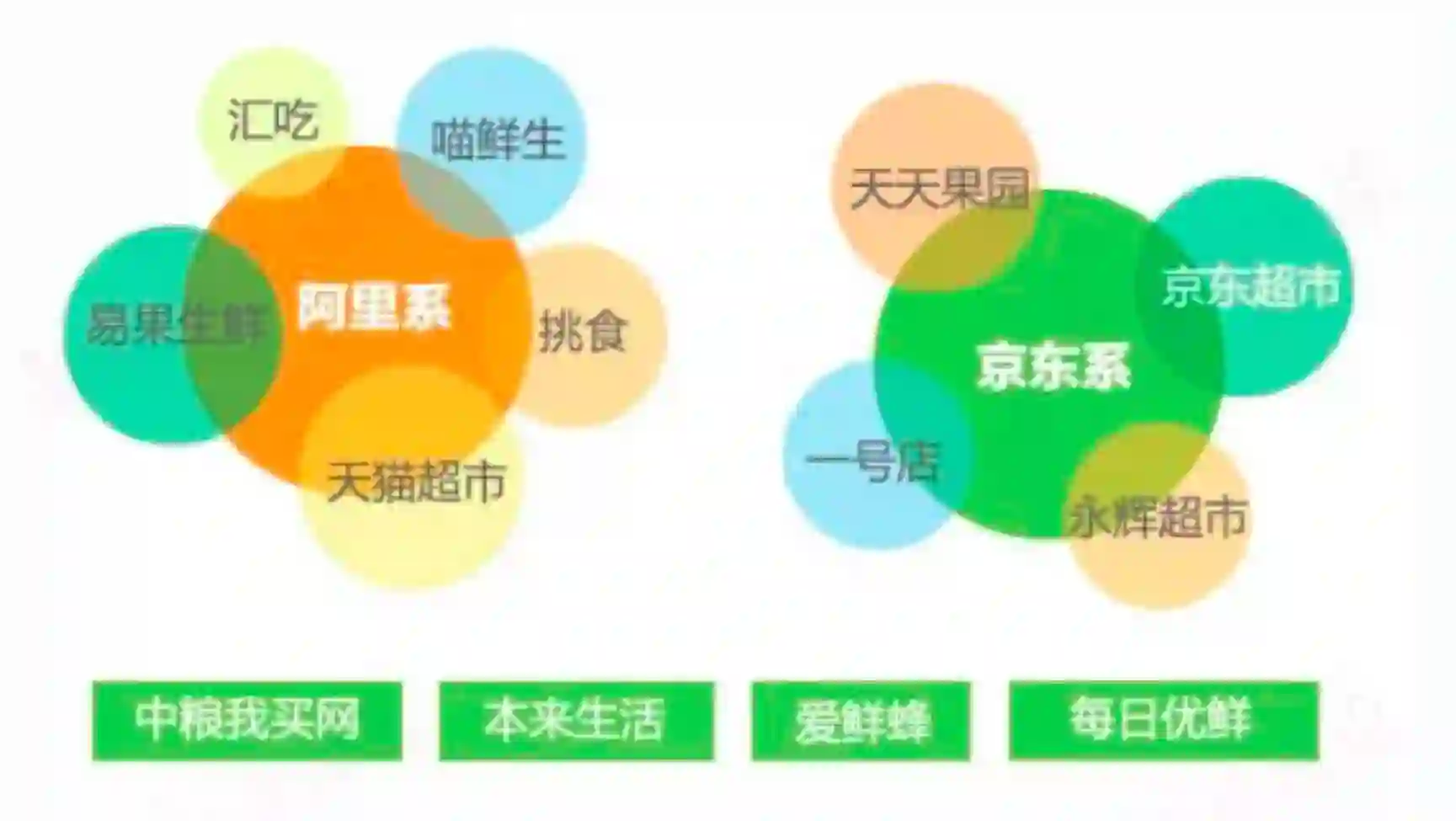 不过,也并非所有的生鲜电商企业都处境堪忧。根据品途商业评论的研究数据显示,生鲜电商领域目前已经形成“两超多强”的竞争格局。“两超”分别是阿里系和京东系,“多强”则是中粮我买网、本来生活、爱鲜蜂、每日优鲜等。