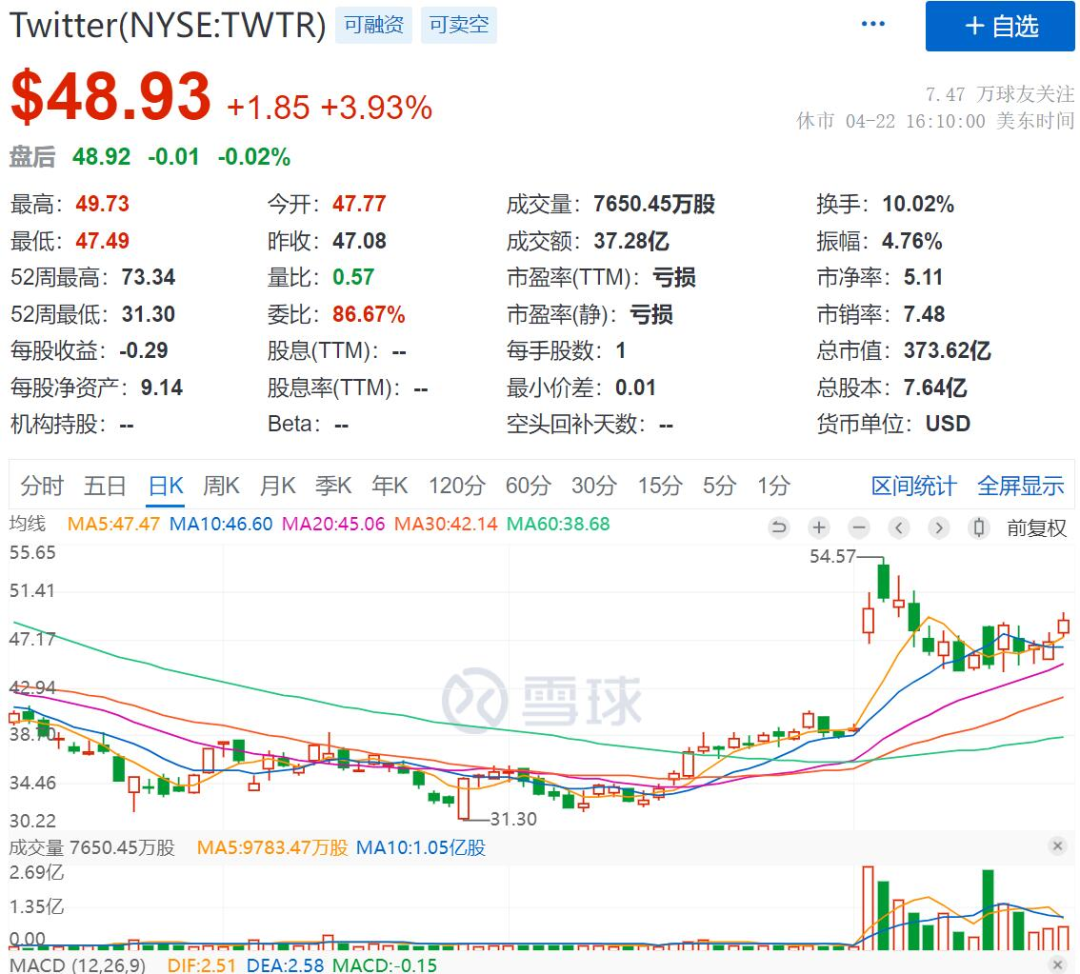 有分析师表示,他们预计推特董事会只会接受估值至少为每股 60 美元的出价。去年,当该公司宣布将收入翻一番的目标时,推特股价升至每股 70 美元以上,但此后由于投资者质疑其实现这些目标的能力,该公司股价已跌至 48 美元左右。
