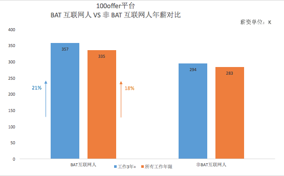 从我们此次统计的薪资数据看,有着 3 年+工作经验的 BAT 人,年薪均值应该已经在 35.7 万左右,普遍高出非 BAT 互联网人年薪的 21%,分别对应腾讯 T3-1、百度 T5-T6、阿里 P6—P7之间的职位(参考等级均为技术岗)。