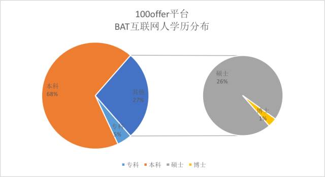 下图是我们平台上,BAT 程序员的学历构成。从中可以看出,本科学历的员工是 BAT 的主力军,其次是硕士学历,专科学历虽然只有 5% 的占比,但仍有生存空间。