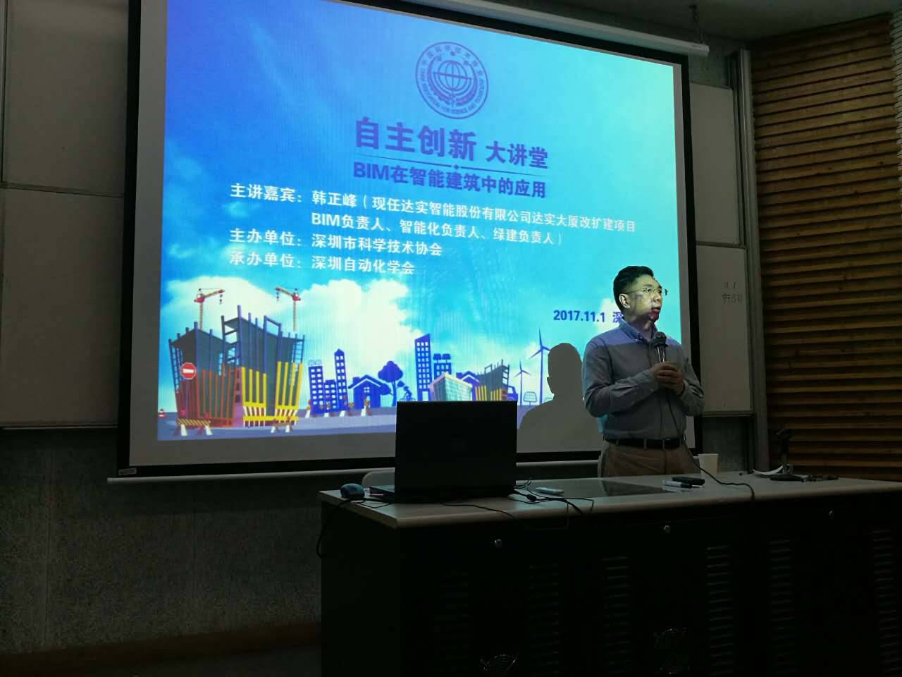 2017年11月1日下午,由深圳市科学技术协会主办、深圳自动化学会承办的“自主创新大讲堂”——《BIM在智能建筑中的应用》在深圳职业技术学院成功举办,机电学院17级智能建筑专业170多名同学参加了本次大讲堂,机电学院郭院长致辞,学院姚卫丰教授、高素萍教授、贾晓宝老师也参加了此次活动。郭院长讲话中提到,自主创新大讲堂走进高校,对学生来讲是非常难得的机会,对学生了解这个行业中的一些新技术、新发展、新趋势非常有帮助,希望同学们认真听讲,积极与专家交流互动。