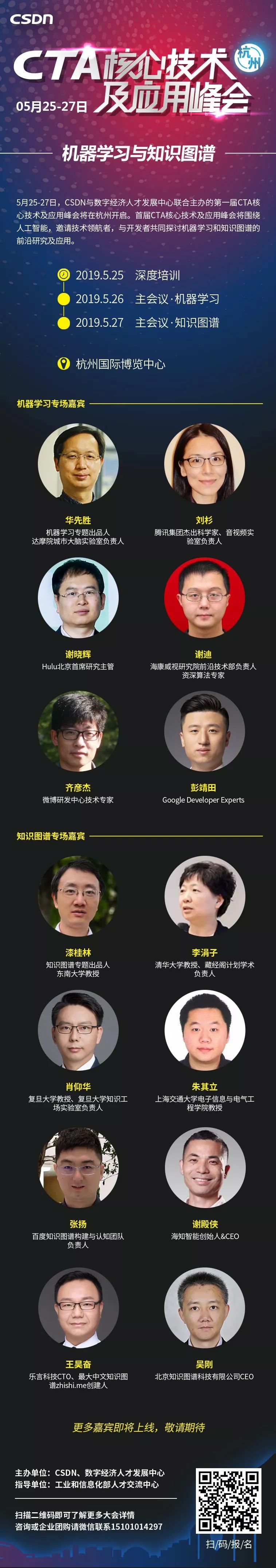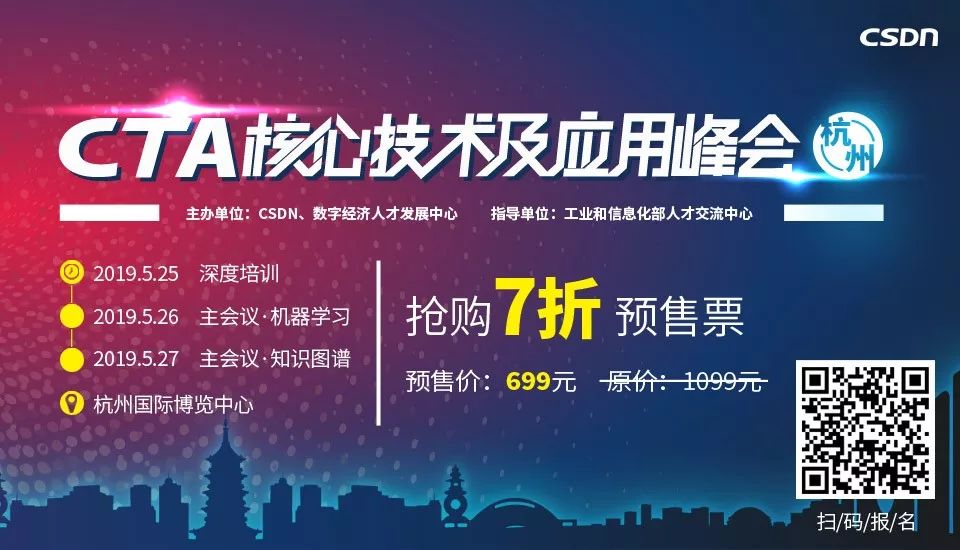 5月25-27日,由中国IT社区CSDN与数字经济人才发展中心联合主办的第一届CTA核心技术及应用峰会将在杭州国际博览中心隆重召开,峰会将围绕人工智能领域,邀请技术领航者,与开发者共同探讨机器学习和知识图谱的前沿研究及应用。