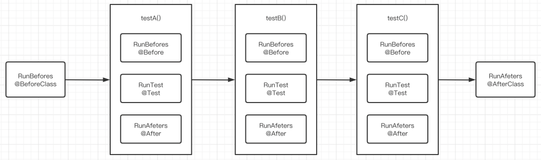 Junit4将@Before、@Test、@After这些注解打标的方法都抽象成了Statement,整个单测的运行过程,实际上就是一系列Statement的运行过程。方法的调用是通过反射的方式实现的。