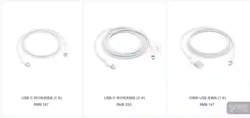 在美国和中国市场,Type-C 转 Lightning 接口的数据线一直都更贵一些,美国1米版本售价为25美元,2米版本售价35美元,而 Type-A 转 lightning 接口(也就是现在 iPhone 的原装线)的数据线售价19美元。在中国,这三款数据线售价则分别为188元、255元和147元。
