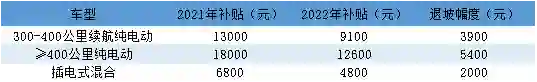根据去年12月31日财政部、工信部、科技部、发改委发布的《关于2022年新能源汽车推广应用财政补贴政策的通知》,明确表示了新能源汽车补贴标准在2021年基础上下调30%。如下表所示,新的补贴政策下2022年,续航里程300~400公里之间的纯电动车型补贴从13000元降至9100元,补贴降低3900元;续航≥400公里的纯电动车型补贴从18000元降至12600元,补贴降低5400元;插电式混合动力车型补贴从6800元降至4800元,补贴降低2000元。