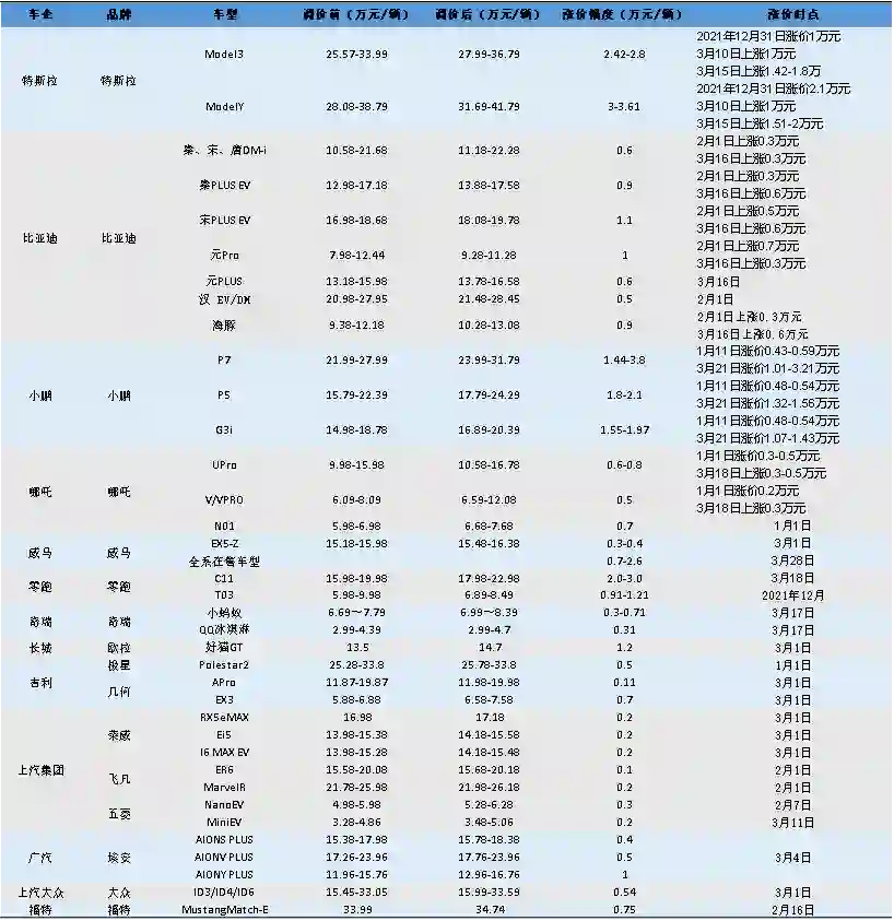 以特斯拉为代表的车企,自去年年底开始不断上调旗下车型的官方指导价,截至3月底,市场普遍涨幅已经达到5-15%的区间。