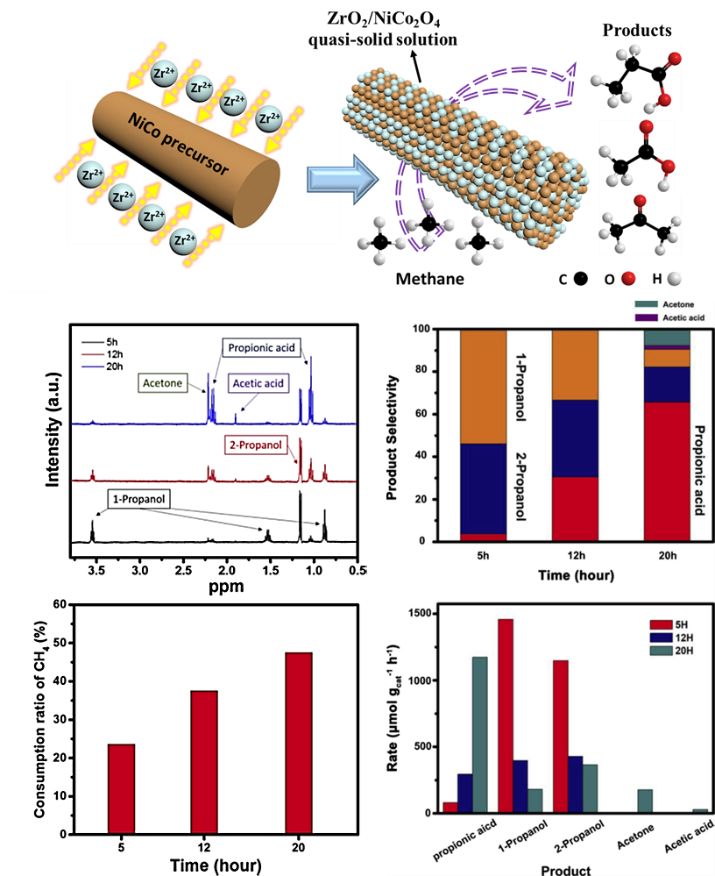 基于上述考虑,研究团队成功研发出一种新型ZrO2:NiCo2O4准固溶体阳极催化剂,并利用该催化剂实现了甲烷电催化转化生成丙酸和丙酮等,20个小时反应后的甲烷转化效率达到47.5%。该ZrO2:NiCo2O4催化剂中,NiCo2O4作为甲烷氧化转化的主要催化成分,利用Ni原子较高的催化活性实现了甲烷的快速氧化,使得正丙醇和异丙醇成为初步的中间产物。随着反应时间的延长,正丙醇和异丙醇进一步被氧化转化成丙酸和丙酮,为该甲烷氧化过程的终产物,经过20个小时反应后的丙酸产率经计算为1173umol/gcat/h。该工作为甲烷电催化转化研究提供了新的研究思路。