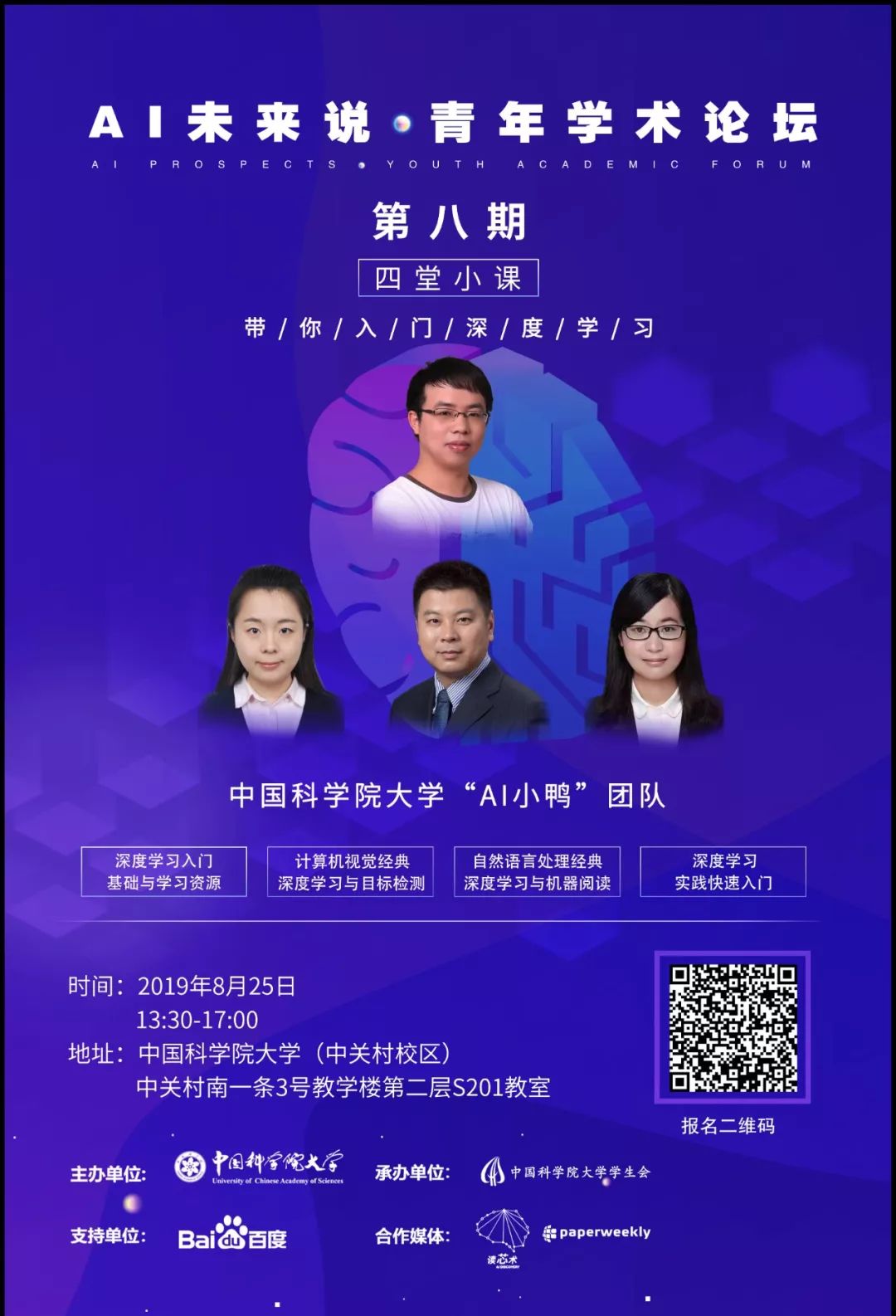 人工智能论坛如今浩如烟海,有硬货、有干货的讲座却百里挑一。“AI未来说”青年学术论坛第八期如约而至。来自中国科学院大学的“AI小鸭学院”教师团队集体亮相,带你看看是什么样的深度学习课程,你们老师也在上。一场专注于青年学者和大学生的AI论坛等你报名,可以快速定位文末报名哦~