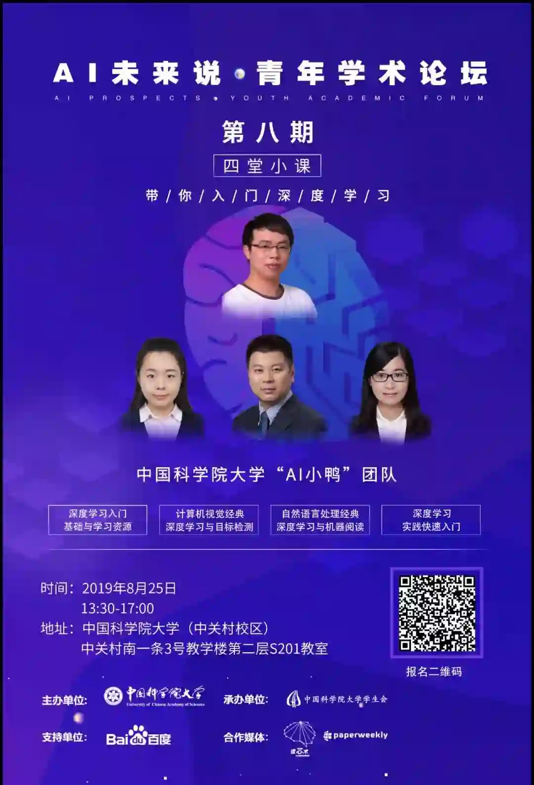 “AI未来说·青年学术论坛”系列讲座由中国科学院大学主办,承办单位为中国科学院大学学生会,协办单位为中国科学院计算所研究生会、网络中心研究生会、人工智能学院学生会、化学工程学院学生会、公共政策与管理学院学生会、微电子学院学生会,百度为支持单位,读芯术、PaperWeekly为合作自媒体。“AI未来说·青年学术论坛”第八期将于2019年8月25日下午13:30-17:00在中国科学院大学(中关村校区)中关村南一条3号教学楼第二层S201举行。