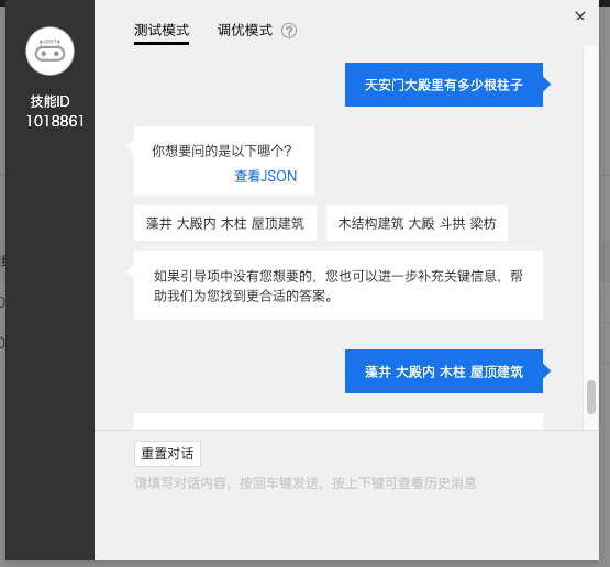 为了让大家可以快速测试,我们在公众号后台绑定了这个天安门知识问答机器人,欢迎大家关注我们进行体验。UNIT研发环境每天请求次数有限,大家先测先得。