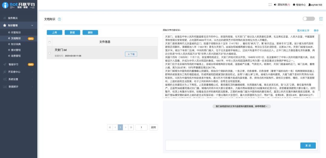 而小i的Bot开放平台将文档知识作为知识管理的一个栏目,并且非常明显地标上了Beta图标。操作方式也同样简单,上传文档即可开始测试。与百度不同的是整个过程甚至无需训练。
