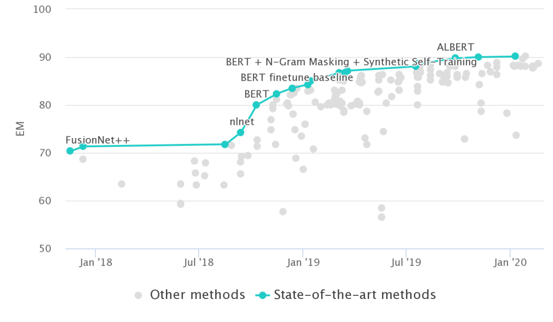 目前阅读理解问题的排行榜已经完全被各种强大的预训练语言模型占领,SQuAD2.0上的SOTA是来自上海交通大学的Retro-Reader on ALBERT[3]。精确匹配准确率达到了惊人的90.115,已经远远超过了人类86.831的水平。