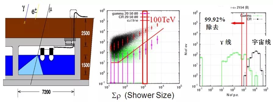 图3. 左:西藏羊八井 ASgamma实验组利用地下缪子探测器,能准确测量宇宙线空气簇射次级粒子中所含缪子数目,用于区分入射的高能宇宙线是质子、重原子核还是高能伽玛射线光子;中图和右图:由于伽玛光子产生的缪子数量远远少于质子和重原子核与空气作用所产生的缪子数量,因此可根据地下缪子探测器探测到的某个事例产生的缪子数量来甄别该事例是伽玛光子事例还是非伽玛光子事例;利用该创新性技术,羊八井ASgamma实验能排除99.92%的非伽玛光子宇宙线事例,从而显著降低它们对高能伽玛光子探测的影响,实现了在 20TeV以上能区的国际最高的伽玛射线探测灵敏度。羊八井ASgamma实验探测到了来自蟹状星云方向的24个高度可靠的100 TeV以上的伽玛射线事例
