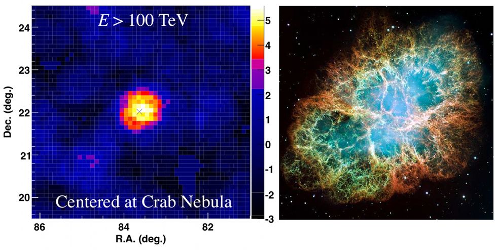 图1. 左图:西藏ASgamma实验观测到蟹状星云方向100TeV以上的伽玛射线;右图:美国哈勃望远镜观测的蟹状星云图片(图片来自于NASA)