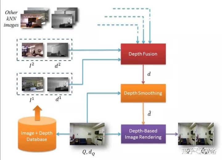 顺便提一下,在3维电视热的时期(2008-2010年左右)大家希望把以前拍摄的单目视频变成立体视频,给3-D电视提供更多的内容,包括3-D显示技术的普及(比如红绿眼镜)大家也想在家里share一些3-D的UGC。这个技术被称为2D-to-3D,通过深度图估计和虚拟立体视觉假设可以生成立体视频,其绘制技术称为DIBR,如下图: