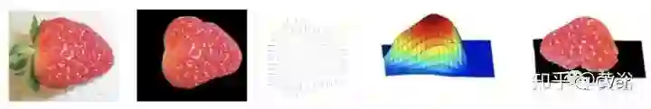 中间第三图是表面法向图,第四个才是深度图。纹理分割是必备的基础(估计是很难的一部分),此外求解这个shape from texture的优化问题,必须加上几个纹理元素(textels)约束条件:homogeneity,isotropy,stationary。