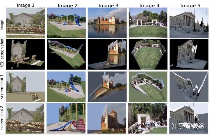 值得一提的是,当时CMU的博士生Derek Hoiem也在研究如何从单目图像中提取出景物的3-D结构,只是他采用机器学习方法在图像分割基础上做了一个简单的语义分割,即“ground”, “sky”, 和 “vertical”标注像素,然后采用简单的平面billboard做纹理映射后变成“pop-up”的3-D景物: