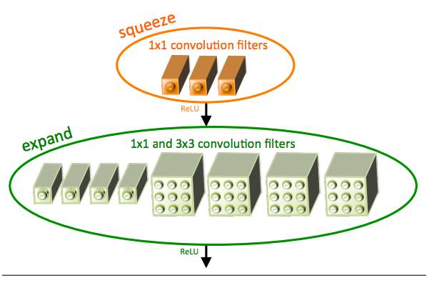 SqueeNet 架构是在移动平台这样的低宽带场景中极其强大的一种架构。这种架构只占用 4.9 MB 的空间,而 Inception 架构大小为 100MB。这种巨大的差距由一种名为 Fire Module 的特殊结构引起。下图是 Fire Module 的表示图: