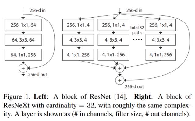 图 1. 左:ResNet 块。右:基数=32 的 ResNeXt 块,复杂度大致相同。层显示为(# in channels, filter size, # out channels)。