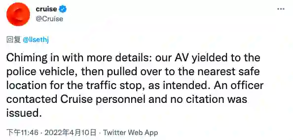 时间来到「AI逃逸」的一周多之后,Cruise在其官方推特上与回复媒体采访的回应中称,这的确不是愚人节恶搞,Robotaxi在遇到执法人员时做了它应该做的事情: