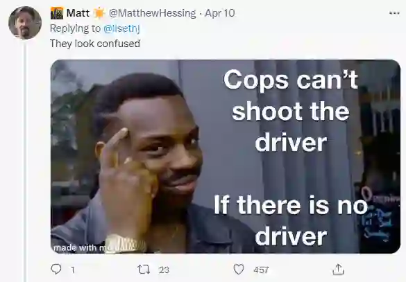 还有网友藉美国常有的新闻讽刺:差佬没法「射杀」司机,因为车里没有司机,一刚!