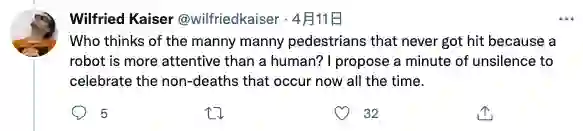 接下来,还有法律上的疑难。的确此次事件中的肇事AI司机没有吃罚单,但同样状况下的人类司机恐怕难以如此轻松地不受处罚。
